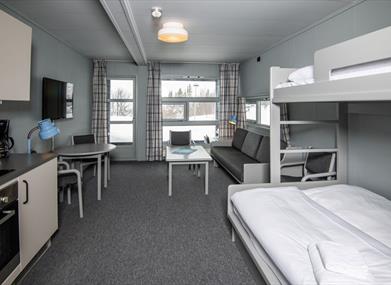 2-room apartment with balcony: 45 m2 which is suitable for up to 5 people and has a bunk bed and an extra bed in an open solution, separate bedroom with double bed, kitchen, dining area, TV, WIFI and private bathroom with shower/wc.