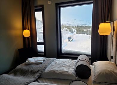 The Apartment Suite is 55 square meters in size, with large windows and a balcony, and 3 bedrooms, as well as a view to Mount Gausta.