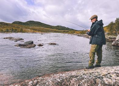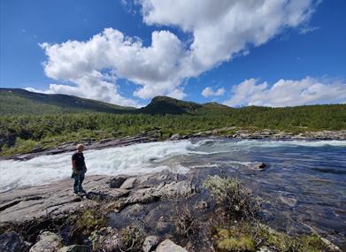 Take a stroll along the Kvenna river, watch the fjord horses graze, see the trout rise, and hear the waterfall roar.