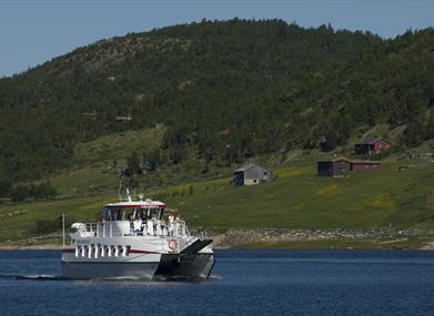 The catamaran Fjellvåken races the 40 kilometers past mountain farms in a stunning landscape. The waterway is the main route for those living permanently along Møsvatn. The freezing and thawing of the lake isolate the area for a few weeks in spring and autumn. Møsvatn, at 918 meters above sea level, offers an unforgettable experience.