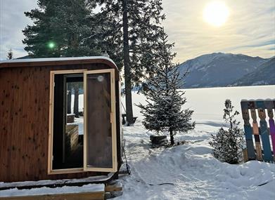 Sandviken Camping is idyllically situated by Tinnsjøen in Tinn Austbygd. Here, a cozy sauna has been set up right by the water's edge.