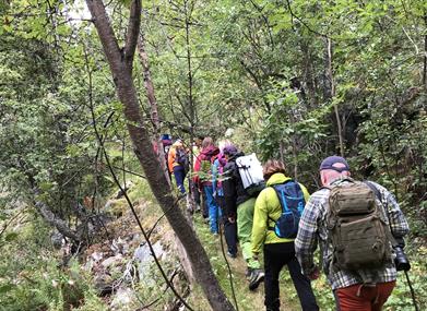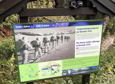 The guided tour starts at 11:00 AM. We hike through Hjerdalen and Fjøsbudalen, with a good break at the Saboteur Cabin, where you'll have time for a meal (remember to bring food and drinks). From there, we follow the saboteurs’ footsteps. We do not cross the gorge but walk over the bridge to Vemork. Once at Vemork, we will visit the Heavy Water Cellar and the power station itself. Guide Gunnar Tveito, who has worked in the Rjukan industry, will accompany you throughout the tour.